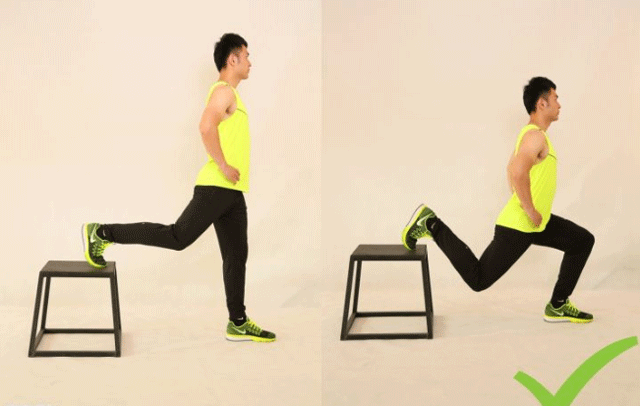 正確動(dòng)作要領(lǐng):后腳放在一凳子上,前腿下蹲,膝蓋略微超過腳尖,軀干正直,挺胸收腹