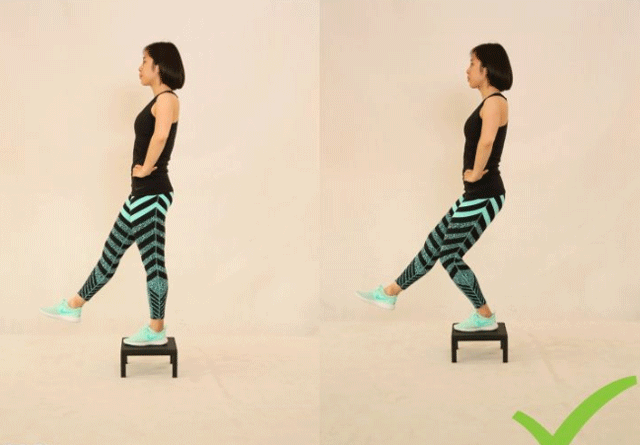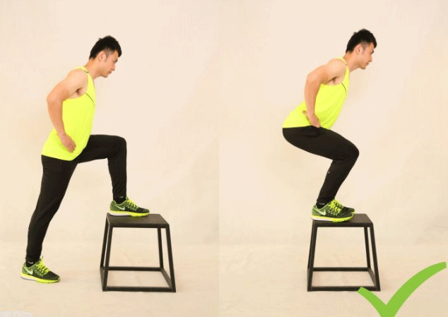 正確動(dòng)作要領(lǐng):一條腿放在凳子上保持不動(dòng),另一條腿發(fā)力蹬地,穩(wěn)穩(wěn)落在凳子上,雙腿膝蓋保持彎曲,腰背挺直,上凳動(dòng)作及還原動(dòng)作時(shí)注意腳輕放盡可能不發(fā)出聲響