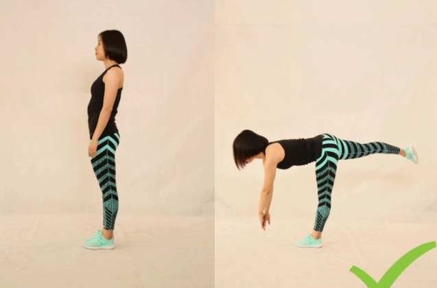 正確動(dòng)作要領(lǐng):支撐腿自然伸直,軀干充分前傾,雙手盡可能往下摸地面,腰背挺直