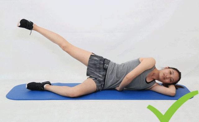 正確動(dòng)作要領(lǐng):側(cè)臥位,上腿伸直做外展動(dòng)作至最大幅度,腳尖始終保持朝前