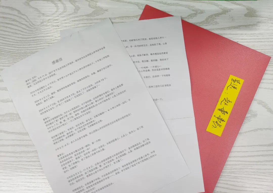 在談到自己在永林就醫經歷時,李大爺飽含熱淚:“是永林醫院,是何曉坡醫生給了我生活的動力和希望,他對我不舍不棄,飽含熱忱為我精心治療,用實際行動給予我無微不至的關心和照顧,對此我和家人都由衷地感謝!”“同時感謝康復科史春燕康復師、骨一科劉肖肖醫生,以及一樓和三樓的導醫姑娘們,她們都給予我很多幫助!”為此,李大爺精心創作了一幅書法作品并飽含深情書寫了一封感謝信送到何曉坡醫生手中。