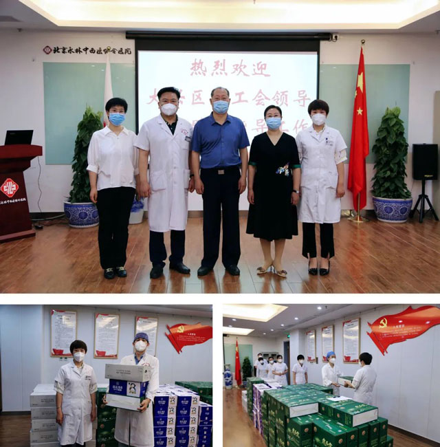 6月16日上午,大興區(qū)人大常委會(huì)黨組副書記、副主任,區(qū)總工會(huì)主席郭金江,區(qū)總工會(huì)黨組書記、常務(wù)副主席牛玉俊,黨組成員、副主席張昊一行來到北京永林中西醫(yī)結(jié)合醫(yī)院,慰問我院一線工作人員,并送來西瓜、蘇打水、涼茶飲料等防暑降溫物資。永林醫(yī)療(集團(tuán))董事長趙永林、黨支部書記趙雨晨、會(huì)主席宋嬌娜、執(zhí)行院長李世榮、行政副院長喬海軍等院領(lǐng)導(dǎo)陪同。?