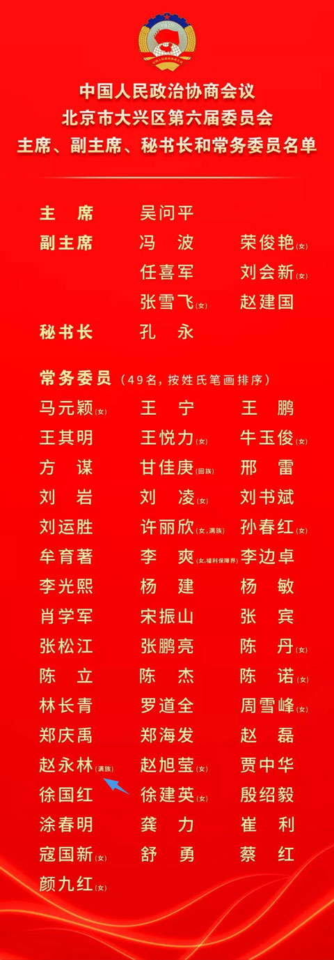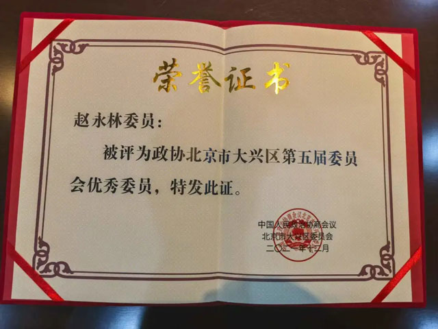 吳問平當(dāng)選為新一屆政協(xié)主席,馮波、榮俊艷、任喜軍、劉會(huì)新、張雪飛、趙建國(guó)當(dāng)選為副主席,孔永當(dāng)選為秘書長(zhǎng),北京永林醫(yī)療集團(tuán)董事長(zhǎng)、北京永林中西醫(yī)結(jié)合醫(yī)院院長(zhǎng)趙永林等49人當(dāng)選為常務(wù)委員。同時(shí),趙永林院長(zhǎng)獲評(píng)為“政協(xié)北京市大興區(qū)第五屆委員會(huì)優(yōu)秀會(huì)員”。